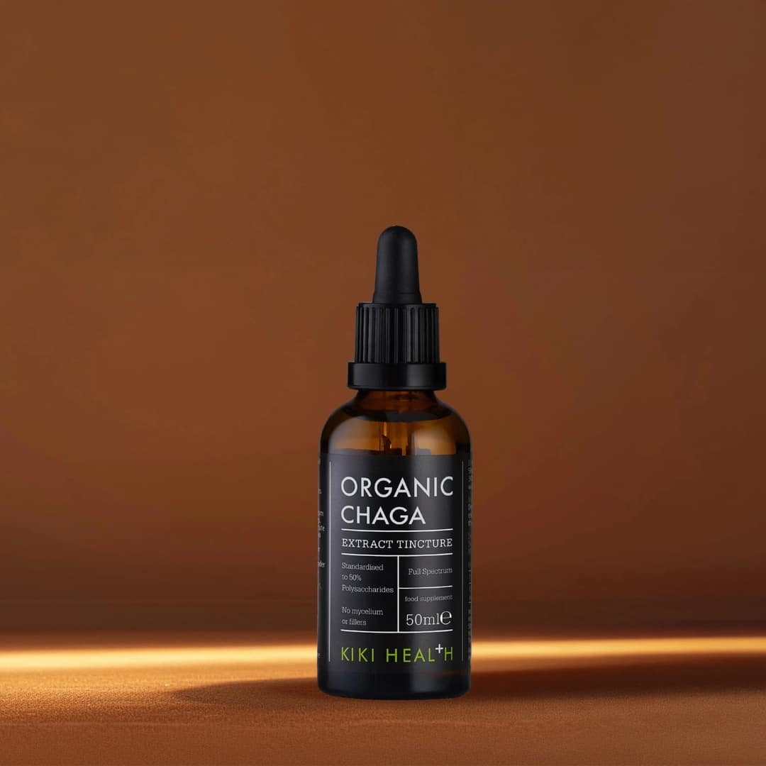 The Organic Chaga Extract Tincture by KIKI Health is a high-potency, full-spectrum liquid supplement derived from wild-harvested Chaga sclerotium, extracted using organic ethanol for maximum bioavailability and nutrient preservation.